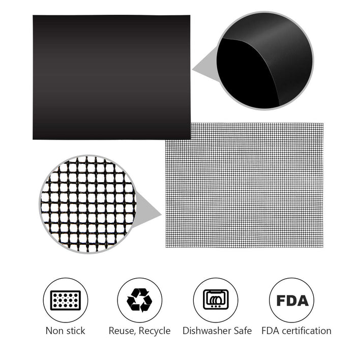 - Made from non-stick PTFE coated fiberglass mesh, which is approved by FDA, SGS, and LFGB. PFOA-Free, no chemical smell and can contact with food directly, you can rest assured to use
