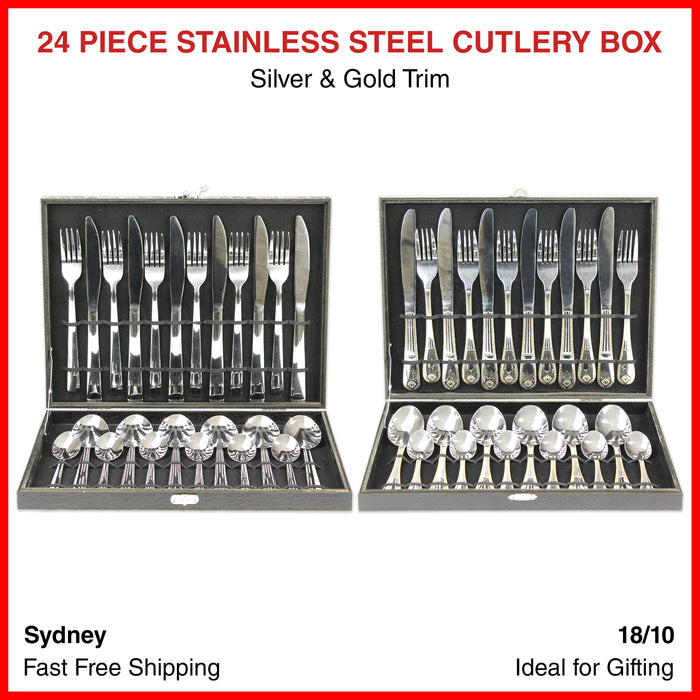 24 Piece Cutlery Box Stainless Steel Set Boxes Silver Gold Bulk Knife Fork Spoon