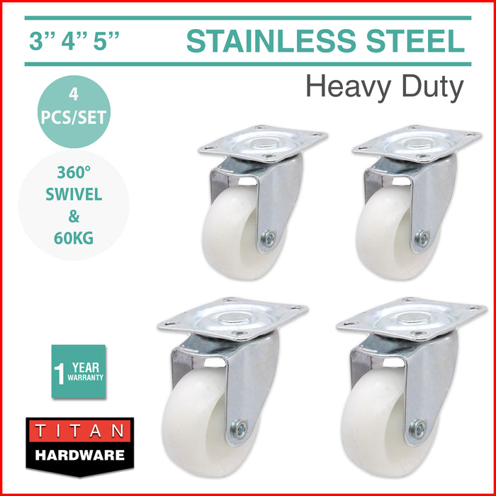 The Titan Hardware 3" and 4" nylon wheels set increases mobility on most hard surfaces such as gravel, tiles, or pavement and have a maximum load rating of 160kg & 240kg.