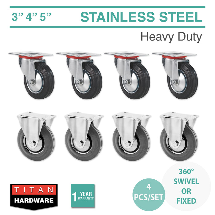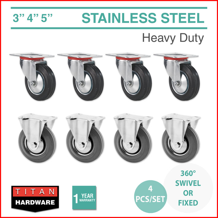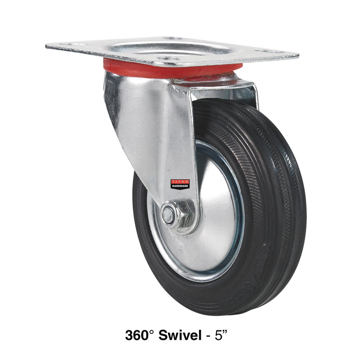 The Titan Hardware 3", 4" and 5" rubber wheels set increases mobility on most hard surfaces such as gravel, tiles, or pavement and have a total maximum load rating of 300kg, 400kg and 500kg.