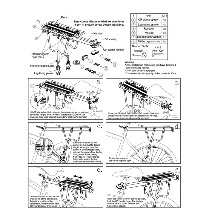 - Adjustable, Quick Release Seatpost Clamp and Frame Mounts