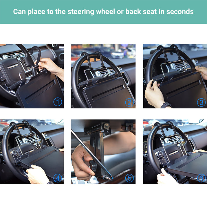 - Hook on your steering wheel, you will get an instant ergonomic desk.