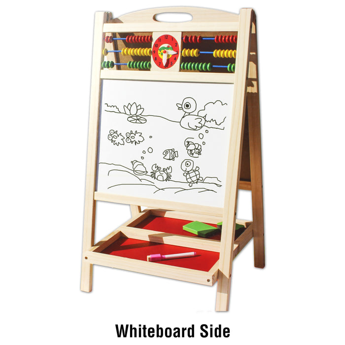 Help inspire your children's talent and creativity with the deluxe floor-standing wooden easel for ages 3 and up. This double-sided easel features a chalkboard on one side and a whiteboard on the other. Each side contains a large storage tray that will hold all of the included art supplies and more.