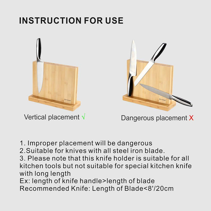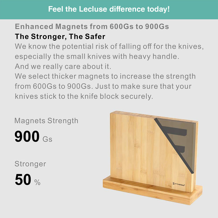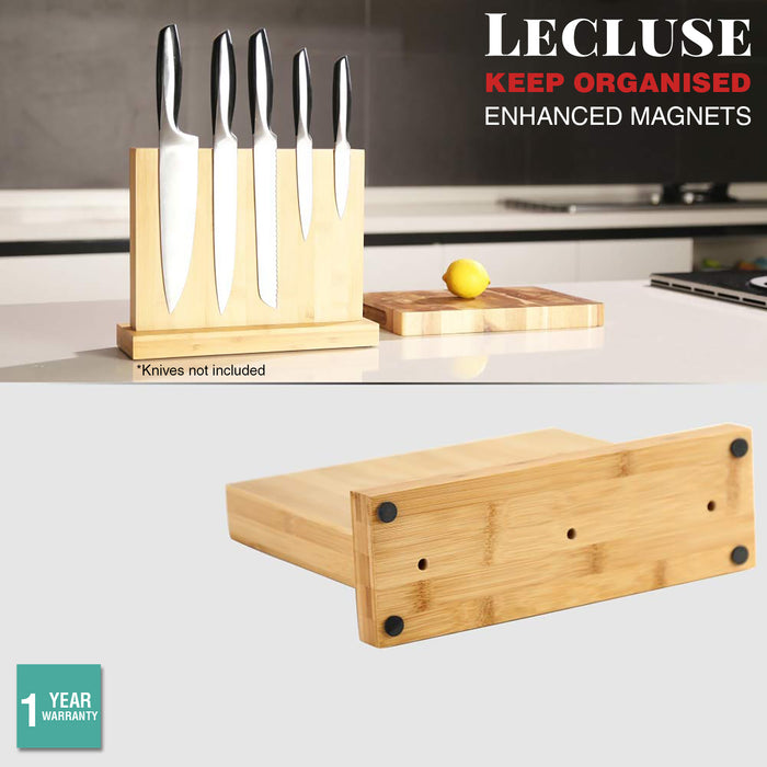 - ✔ GORGEOUS DESIGN. Are you tired of the messy kitchen counter? You need a partner to help organize your knives! Lecluse magnetic knife holder which is made of natural bamboo, is just as elegant as it is functional! Our universal knives block can store knives up to 8 inches/ 20cm (blade) safely