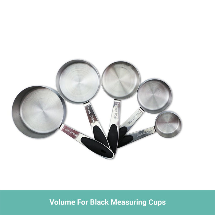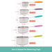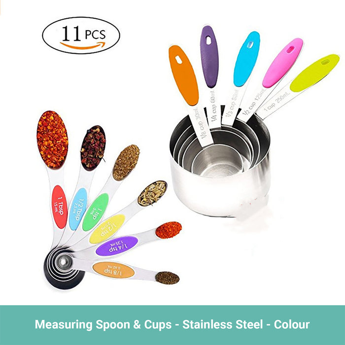 • Stainless steel smooth-edged cups and spoons with silicone handle in a stunning array of shades – sizes engraved in handles in US and metric measurements.