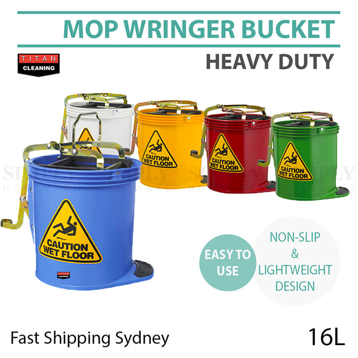 With a vibrant 5 colour range (and more to come), this lightweight design Titan Hardware 16L wringer mop buckets with non-slip foot pedal and ultra maneuverable castors are perfect for both domestic and commercial applications.