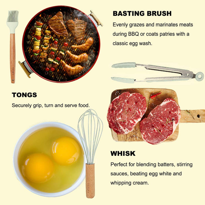 • SET OF 12: No more improvising. This set gives you the right tool to tackle that task. It includes a spatula, slotted turner, food turner, pasta server, soup ladle, slotted spoon, round spatula, tongs, basting brush, solid spoon, and whisk; useful home and apartment kitchen essentials that make cooking a treat.