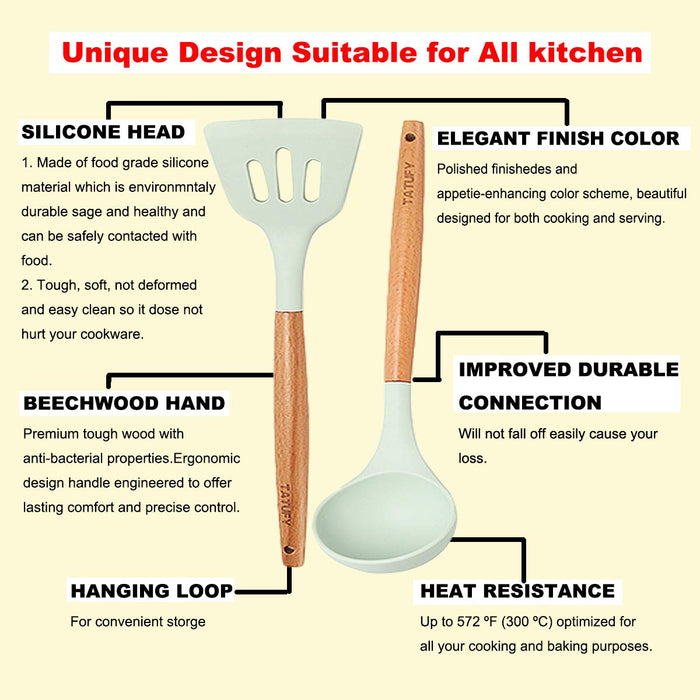 • NON-STICK SAFE: Unlike metal utensils that scratch your expensive non-stick pans and pots, ours are designed with soft silicone heads to keep your cookware pristine. The utensils also have hanging holes on the ends of the wood handles for space-friendly and convenient storage.