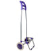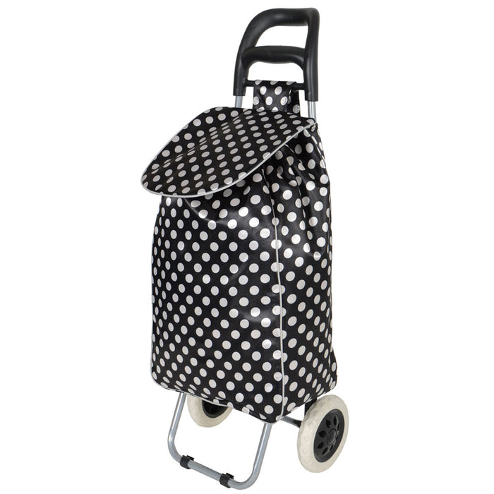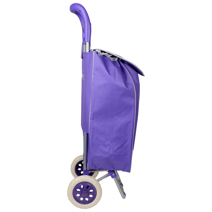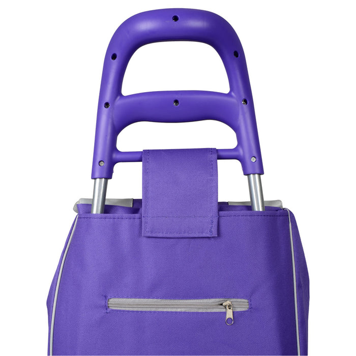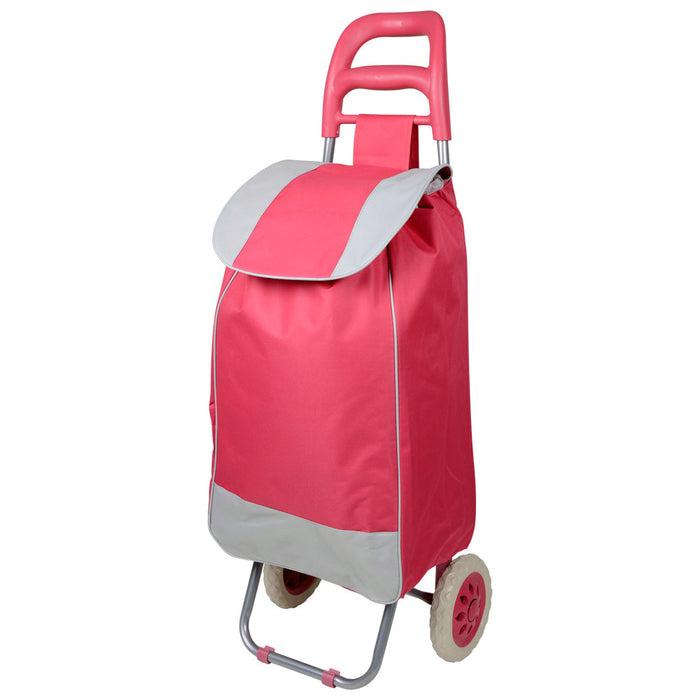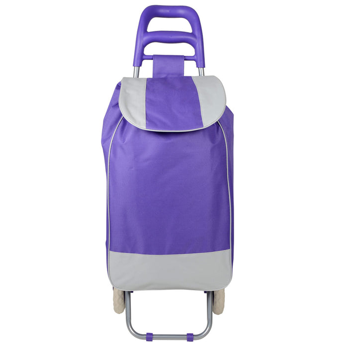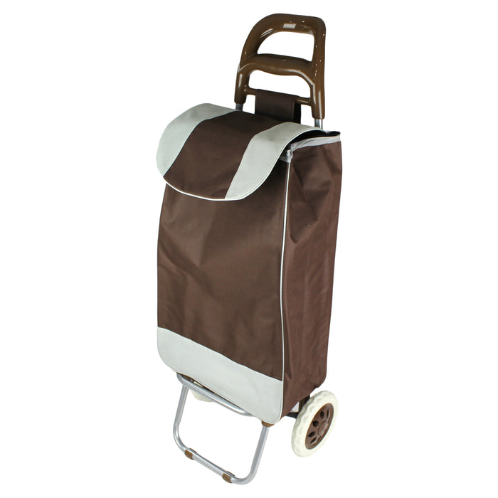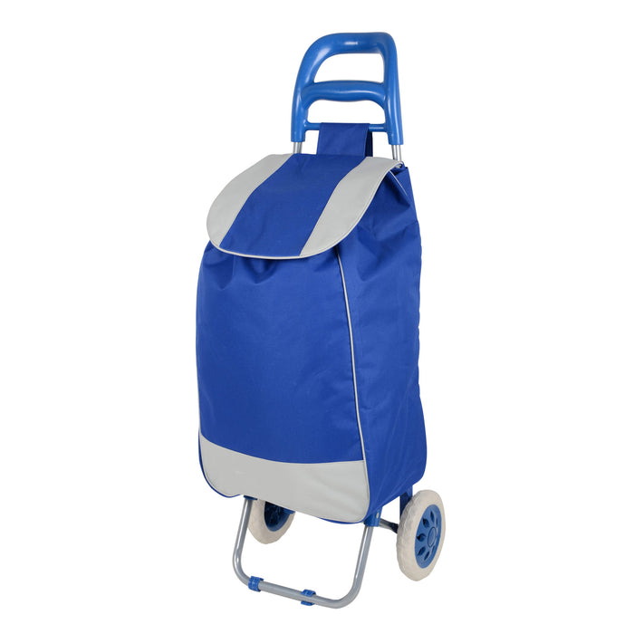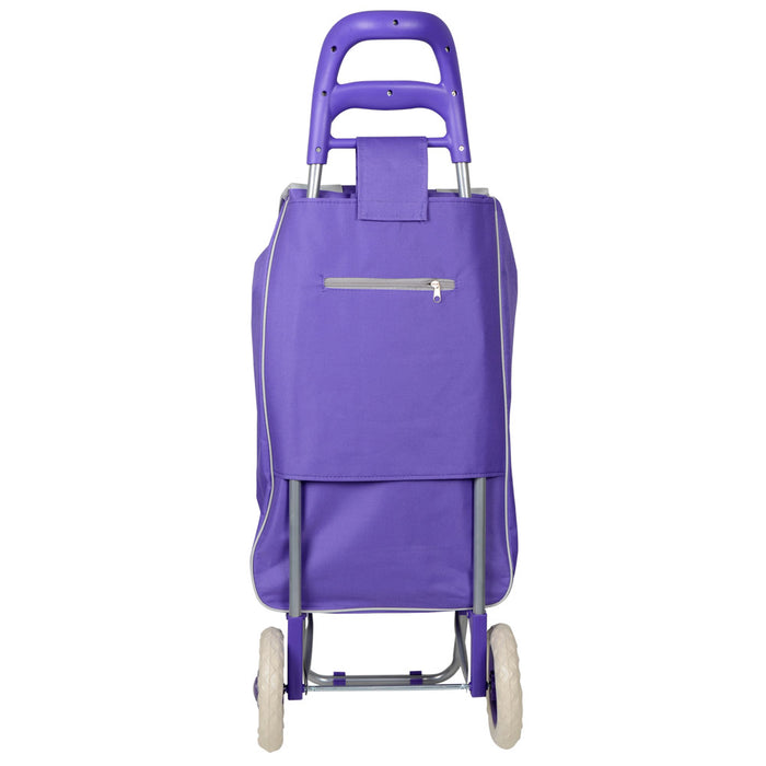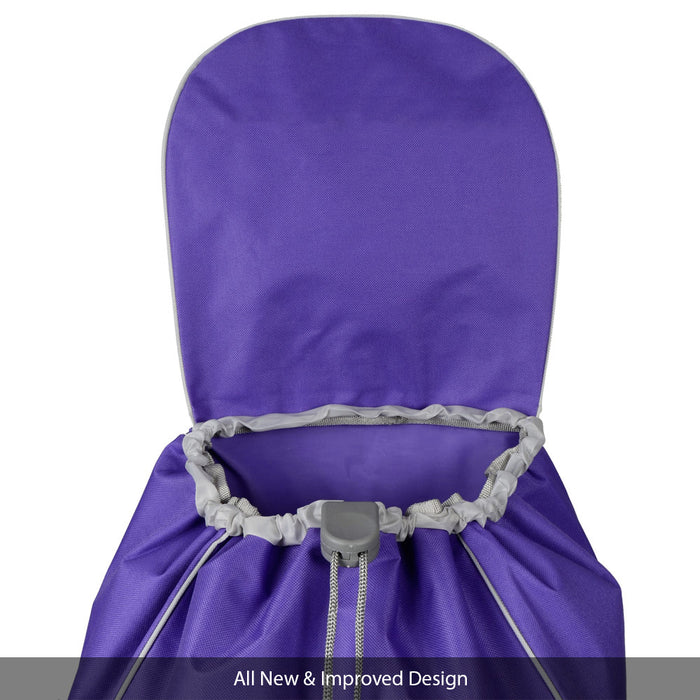 The trolley has a new lightweight design that is foldable for easy transport or convenient storage when not in use. Features include drawstring open/close with flap covering main storage section and a large zip pocket on the back for your phone, purse, or wallet. Silver/grey steel tube frame with two 6.5" EVA wheels and comfortable black handle. Bag slips over frame and is secured with a velcro strap.