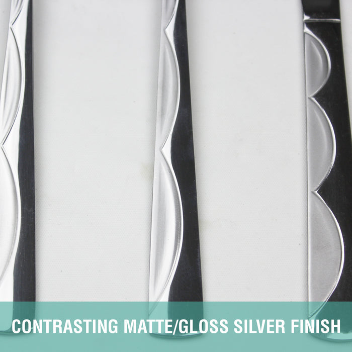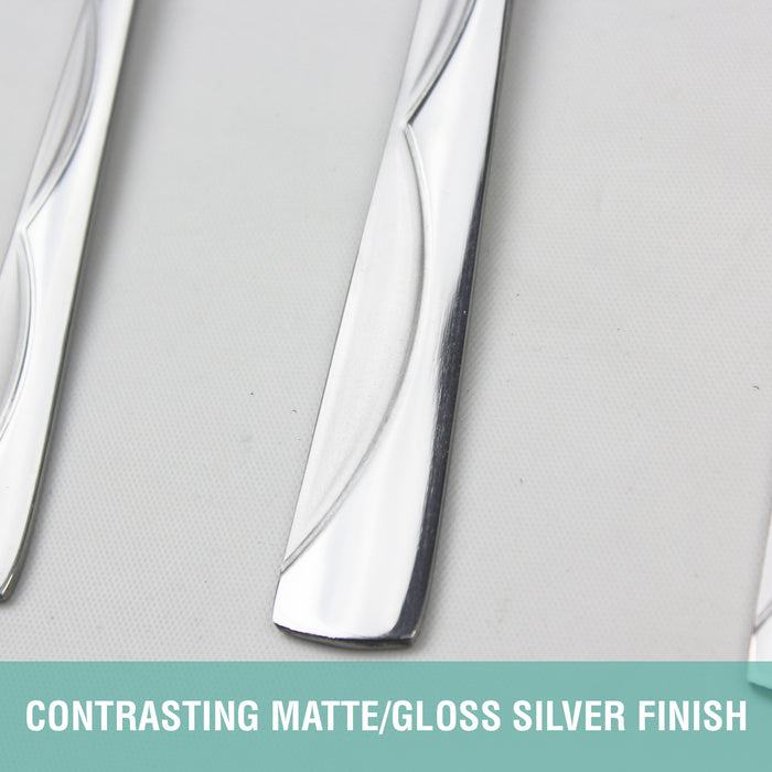 - SIMPLE & ELEGANT DESIGN: The design of flatware set is simple with no crazy patterns or shapes. Shiny and sleek lines, especially the edges where your fingers hit are smooth for safe use. High hardness, no distortion, durable construction. This perfect looking cutlery set is essential for the impeccable table setting to impress family and friends, appropriate for formal events or everyday meals.