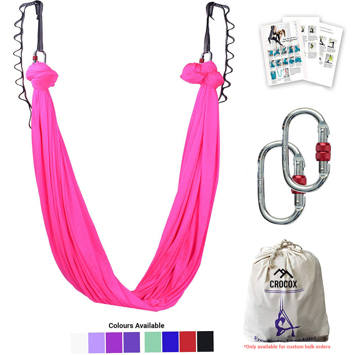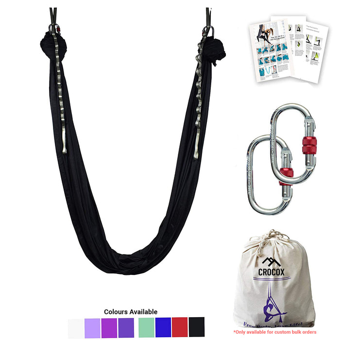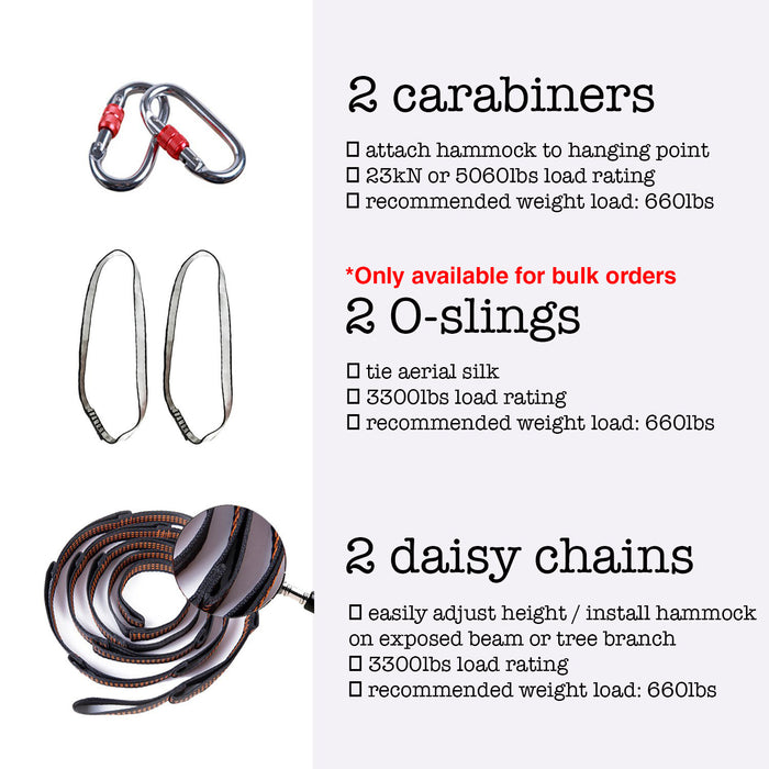 - ✔ BONUS VALUE: The aerial hammock kit comes with aerial silk fabric (13 feet length, 9 feet width), 2 steel carabiners, 2 extension straps (each 3-feet length), 2 O-slings (only for bulk/wholesale orders), and a 2-page guide. Featuring an iron-clad weight capacity ensuring your safety practicing on our hammock. NOTE: Mounting rig is NOT included. Must be purchased separately as required.